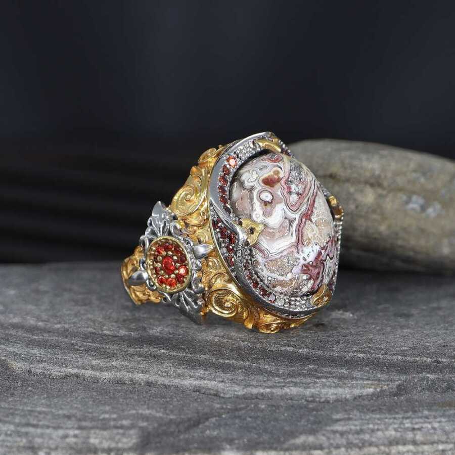 Rhodium Plated Lace Agate Stone 925 Sterling Silver Men'S Ring