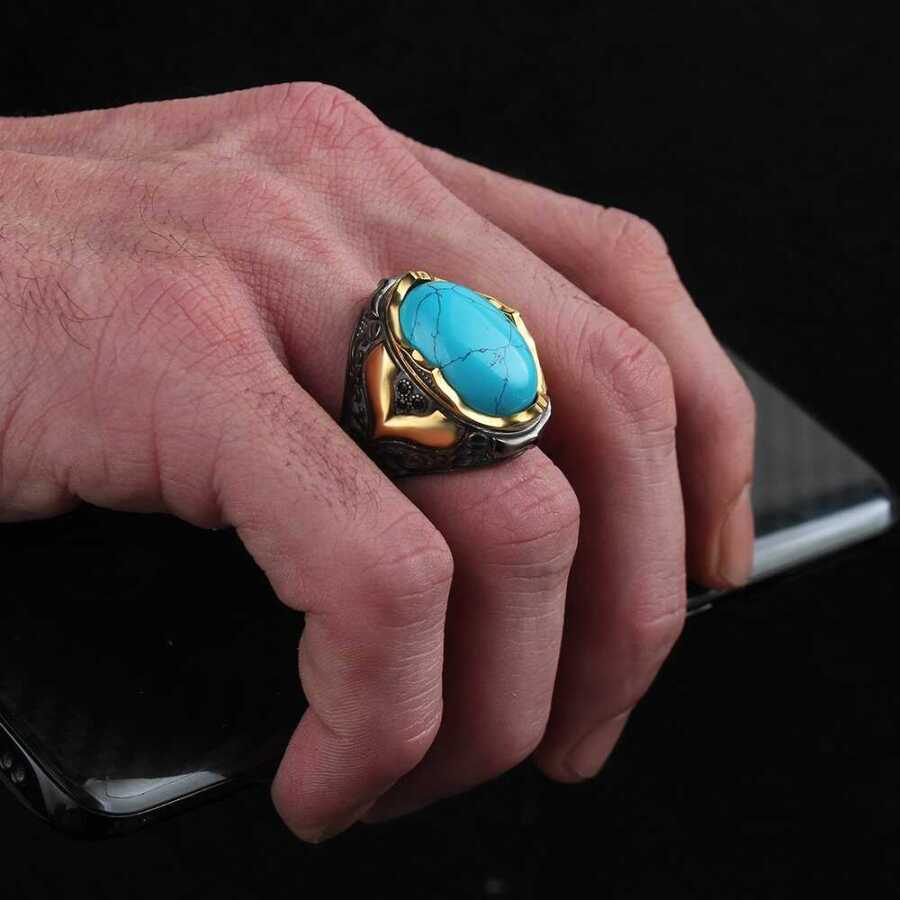 Rhodium Plated Turquoise Stone Men'S Silver Ring
